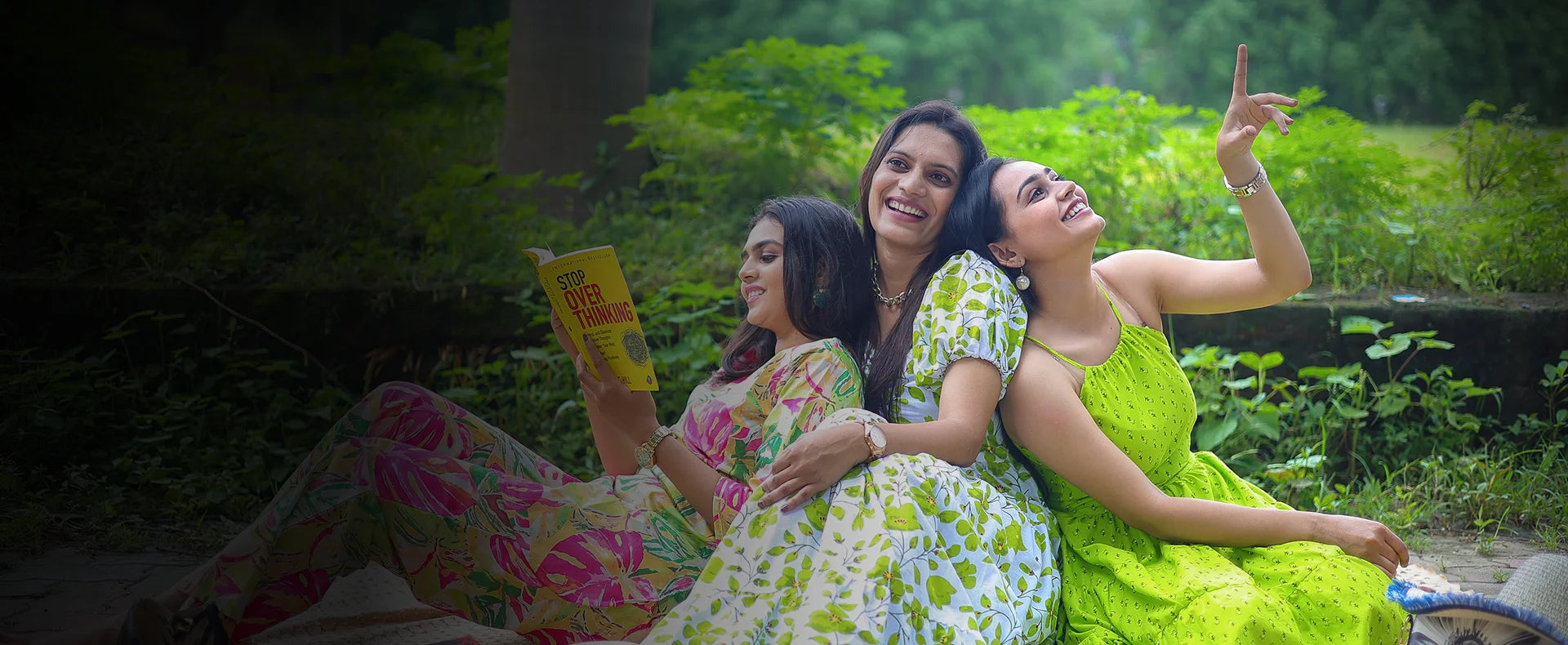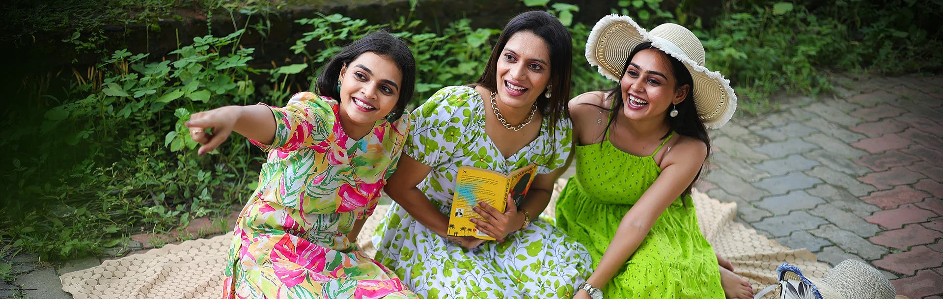 - Top – Navy blue with white motifs; Skirt – Off-white base with blue, orange, and yellow floral prints