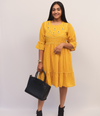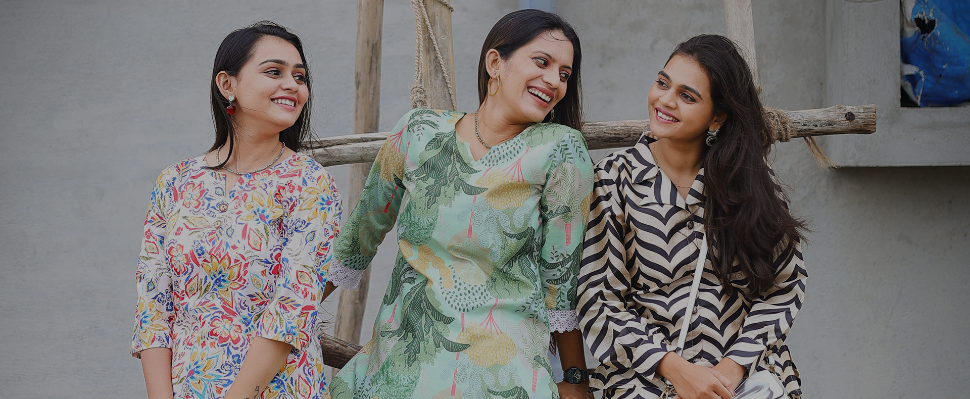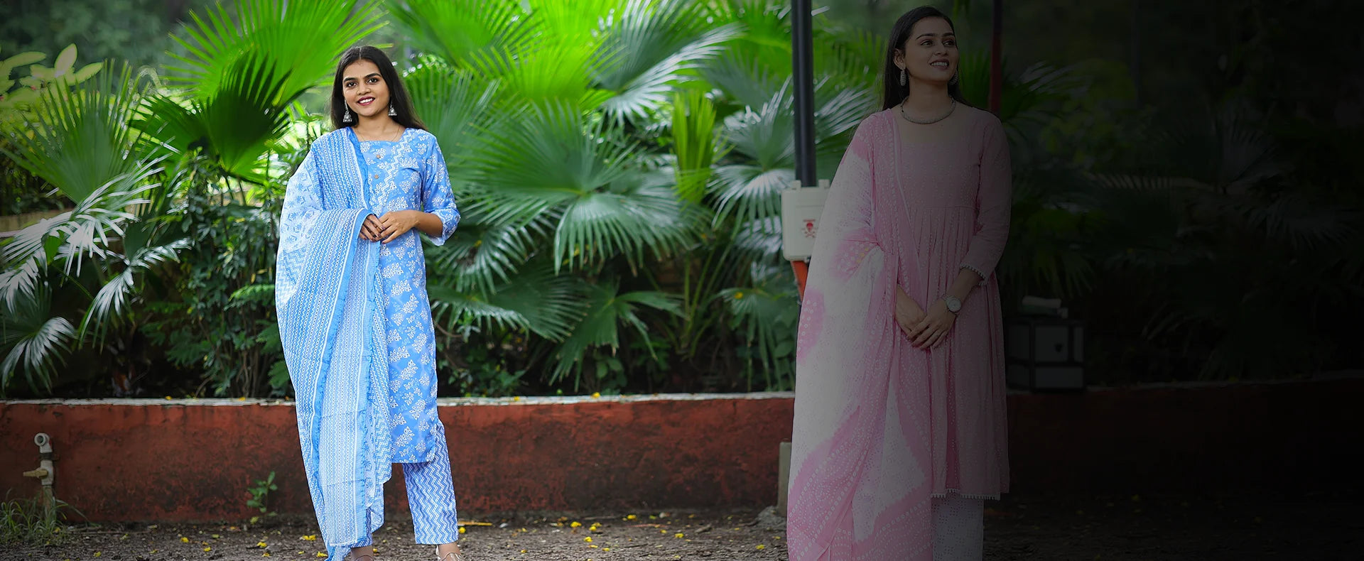 - Top – Navy blue with white motifs; Skirt – Off-white base with blue, orange, and yellow floral prints