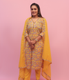 - Pink kurta with white, yellow, and pink bandhani patterns; White palazzo with multicolor geometric print; pink and white dupatta
