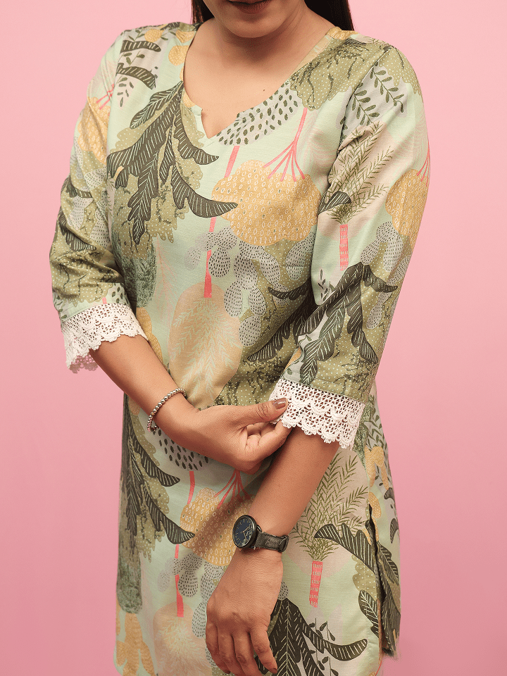 This soft pastel green two-piece co-ord set features a matching top and pants with an abstract botanical print in yellow, black, pink, and green tones. The top is designed with a round neckline with a subtle V-slit, 3/4th sleeves adorned with delicate white lace trim, and a straight hemline. Paired with coordinated pants in the same print for a chic and comfortable look.