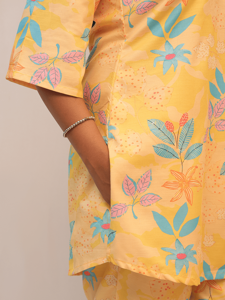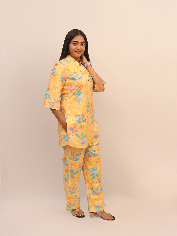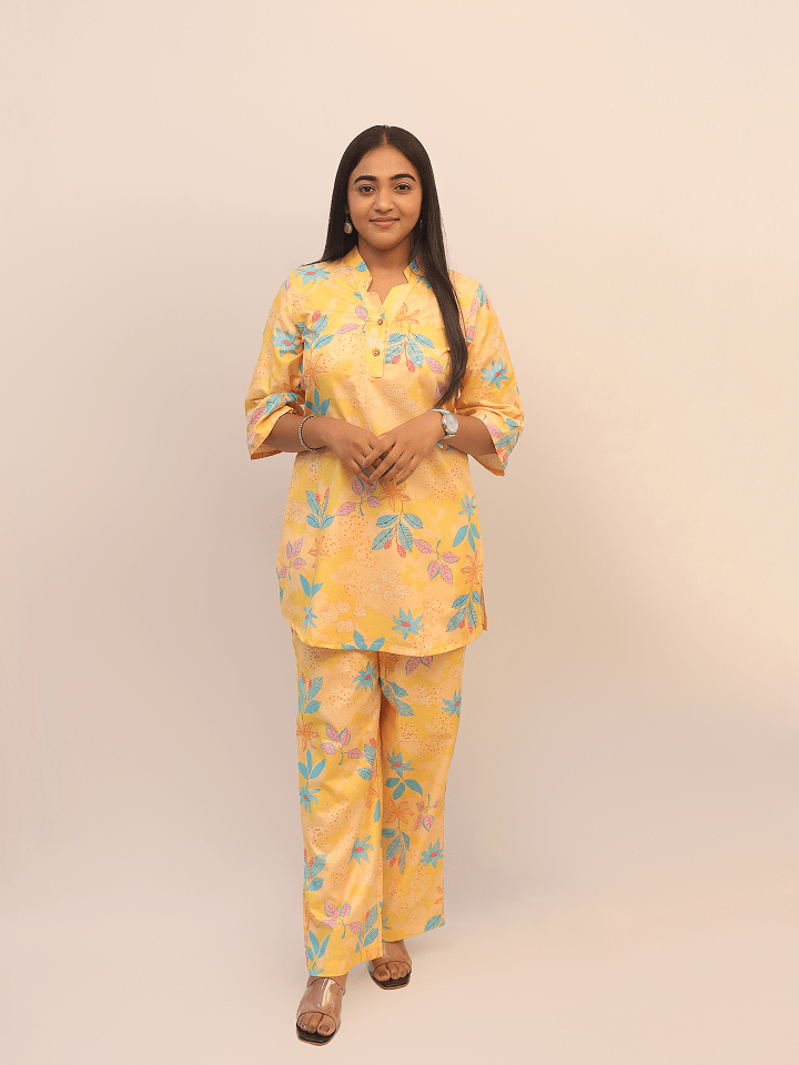 This cheerful two-piece co-ord set features a matching top and pants in a bright yellow base with colorful floral and leaf motifs in blue, pink, purple, and orange. The top has a mandarin collar with a V-slit, partial button placket, and 3/4th sleeves, paired with straight-fit pants in the same vibrant print for a coordinated summer-ready look.