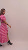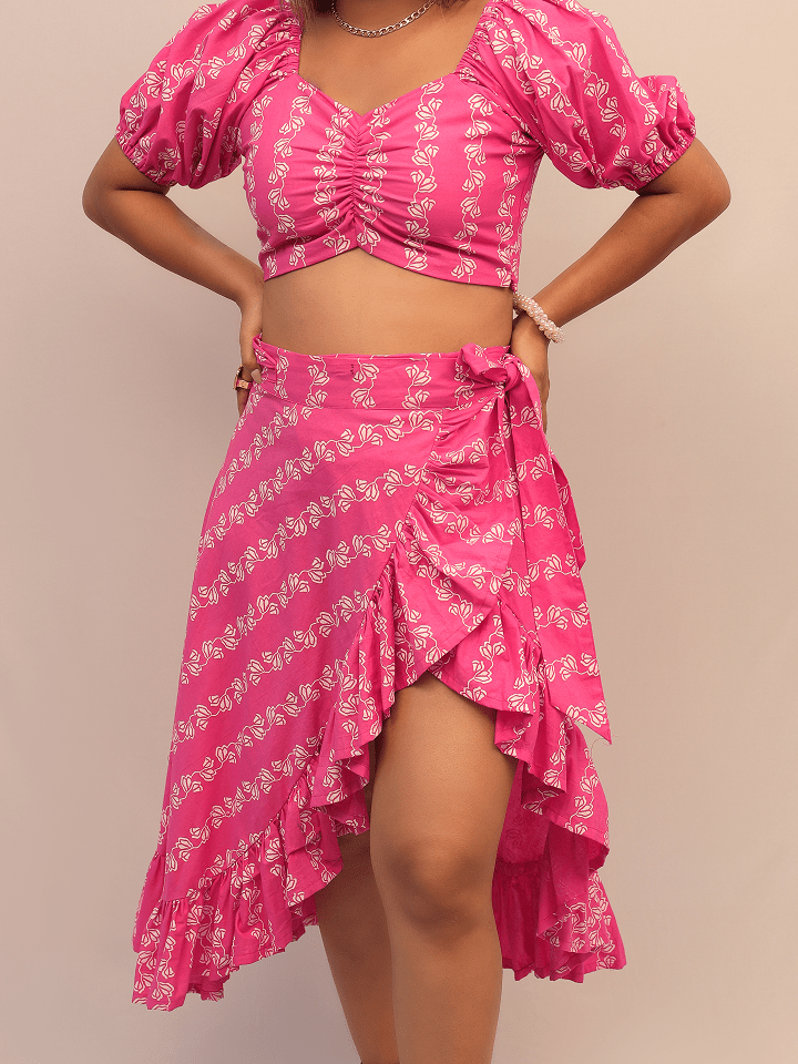 This vibrant co-ord set features a ruched crop top with puff sleeves and a wrap-style asymmetrical skirt adorned with cascading ruffles. The playful print and bold color make it perfect for a chic, statement look.