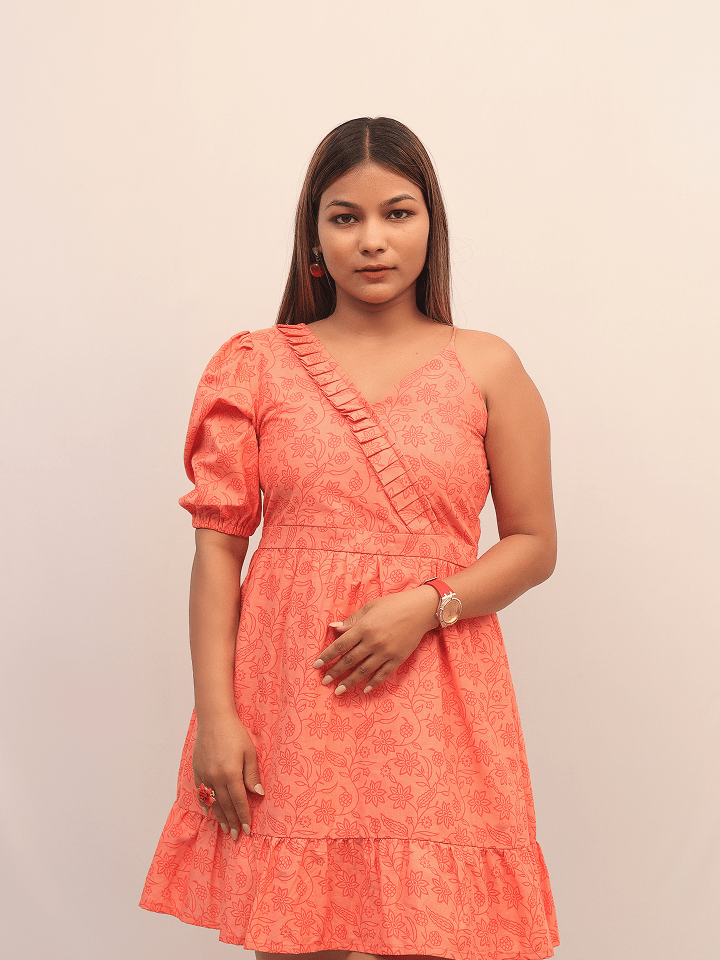 Stylish coral-orange mini dress with all-over floral print, featuring an asymmetrical design with one puff sleeve and one thin strap, accented by pleated frill detailing along the neckline and a flared hem.