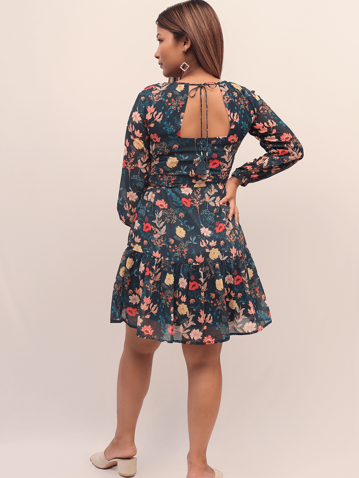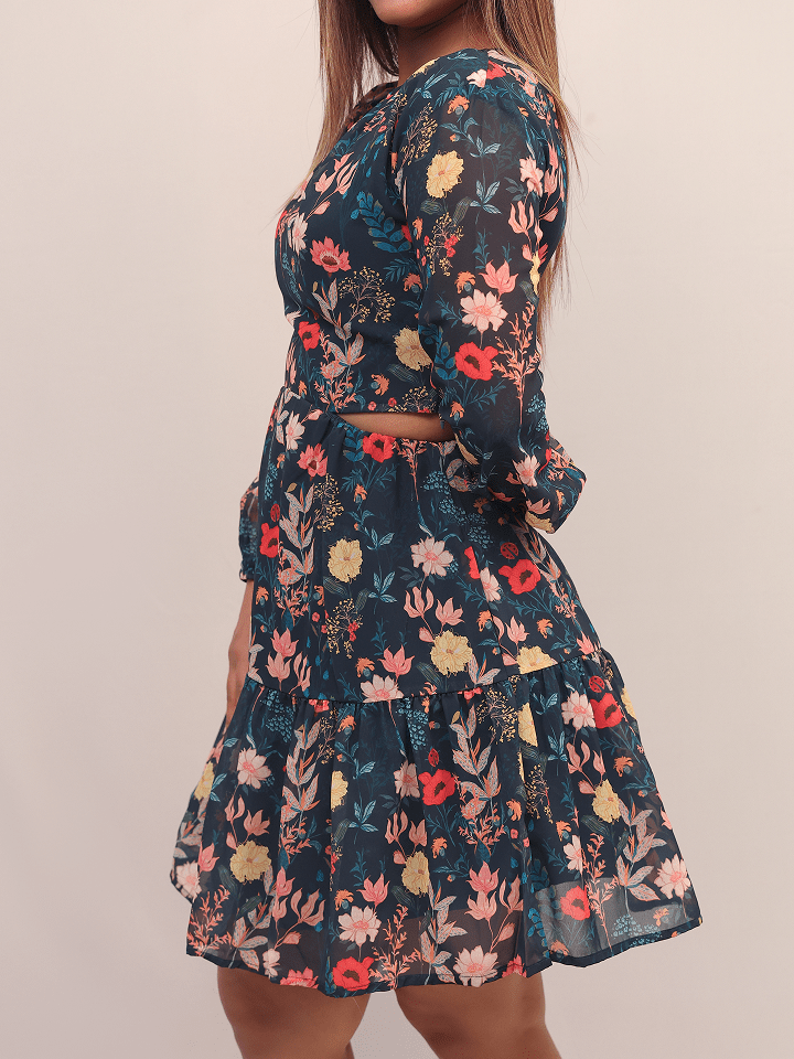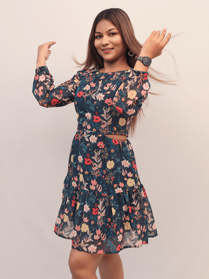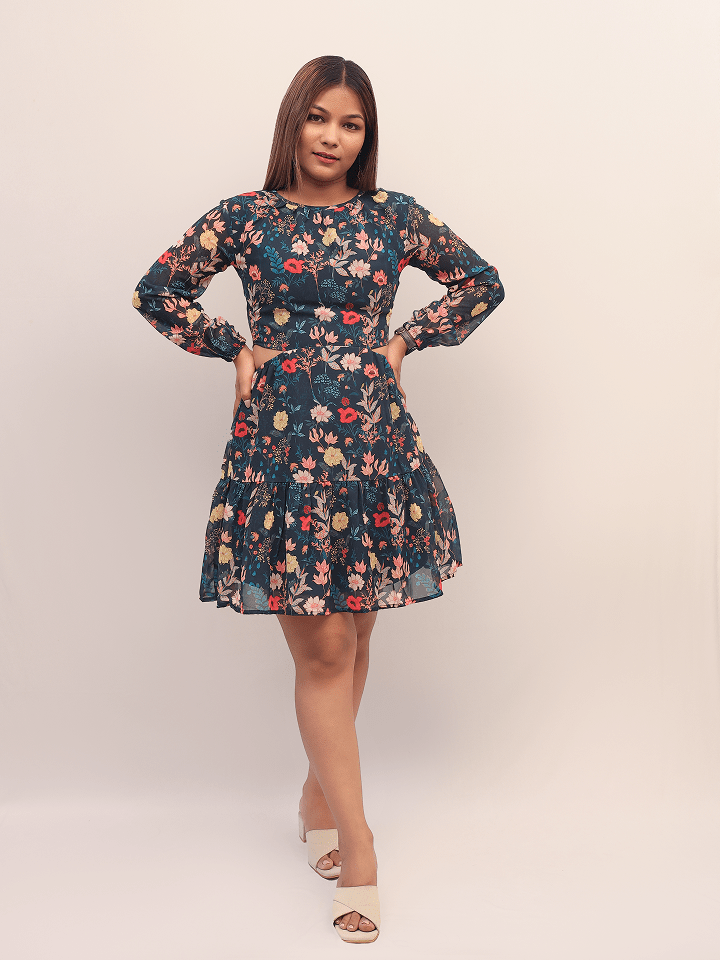 Designed with a high round neckline and soft gathered detailing at the cuffs, it offers a modest yet trendy look. The flattering side cut-out at the waist adds a hint of allure, while the fit-and-flare silhouette with a tiered hemline ensures comfort and movement all day long.