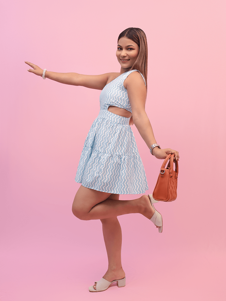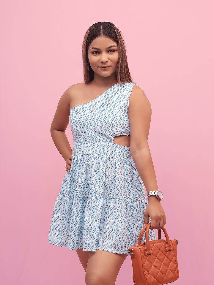 Stylish mini dress featuring a playful zigzag print, asymmetric one-shoulder design, and a flattering side cut-out at the waist with a tiered skirt.
