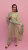This refreshing three-piece suit set features an off-white base kurta with sage green floral prints paired with matching printed pants and a coordinated sage green dupatta with subtle patterns and border detailing. The kurta showcases a front yoke with a vertical stripe and floral patterns, highlighted with delicate lace trim.